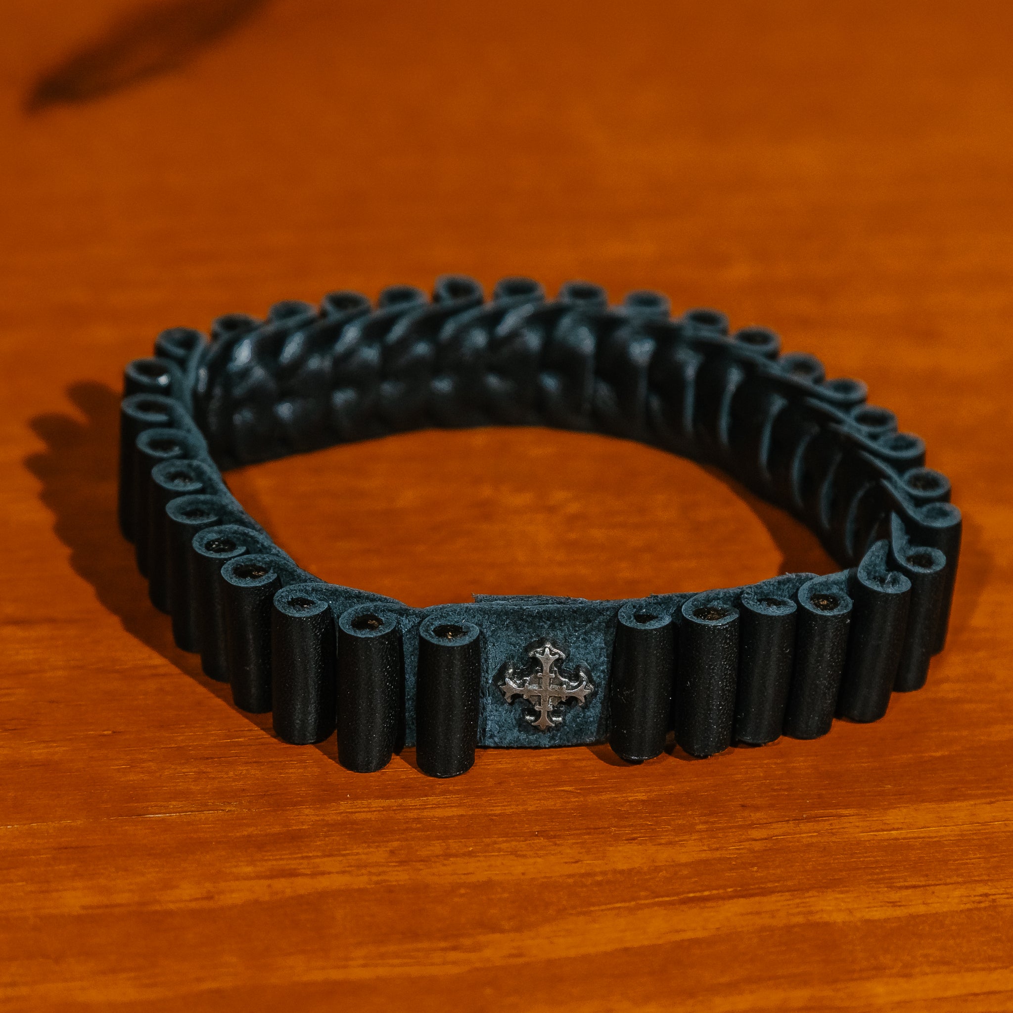 Центральная часть — кожаная перемычка с металлическим крестом.